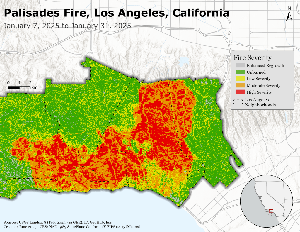 I determined the approximate burned area during the 2025 Palisades Fire in California using the differenced Normalized Burn Ratio of pre- and post-fire Landsat 8 imagery. The analysis was done using Google Earth Engine, and the map was created in ArcGIS Pro.